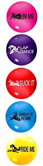 They come in Yellow, White, Blue, Green, Red, Purple and Orange and have assorted sayings such as - 69 Me, Lap Dance, Suck It, Ride Me and more.
