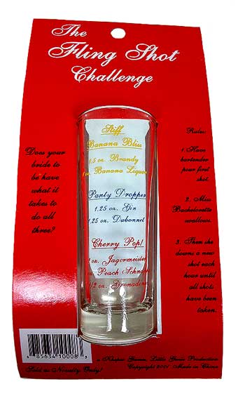 The shot glass is made of 'real' glass and has a cute little hunky guy embossed on the front, and on the back it has 3 different drinks listed (on the glass) - Stiff Banana Bliss, Panty Dropper, and Cherry Pop recipes.