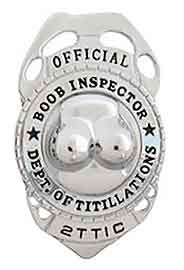 The badge is made of metal and states 'Official Boob Inspector' Dept. of Titillations and is fun to 'flash' your badge to all the unsuspecting patrons, maybe even getting a little 'action' whether it is you who flash yours or get some flashed to you!!