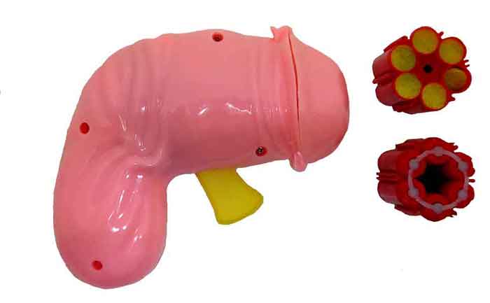 The gun is pretty large measuring about 5" long and quite substancial in girth,and somewhat realistic looking as a very short stout pecker.