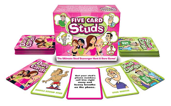 The 5 Card Stud Bachelorette Party game box contains 50 Dare Cards. Each contains two parts one to track down the Studs, 2nd- once you have found the guy pictured on the cards, then there are Dares to perform.