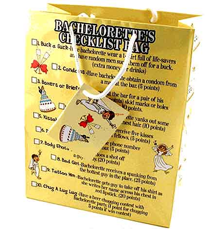 This smart looking bag is plenty big for most of the bachelorette favors & supplies you might want to pick up, and as an added bonus the bag has a funny checklist / scavenger hunt list on the sides of it, so it is a a short funny game that can be played as well.