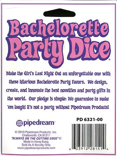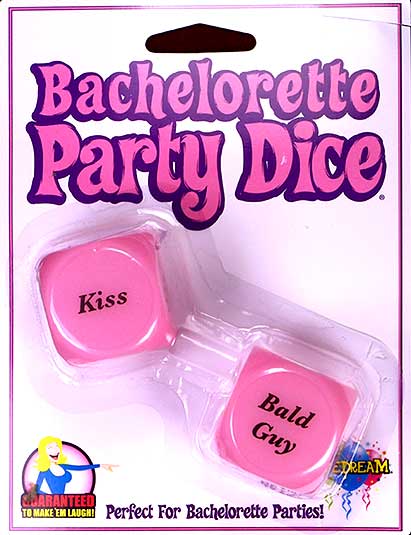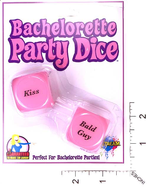 The Bachelorette Party Dare Dice have different dares on each one, with one side giving the action, like - Kiss, Dance With, Sing To, Wink At, Hug / and the other die has the type of guy - Bald Guy, Short Guy, Drunk Guy, Nerdy Guy, Tall Guy.
