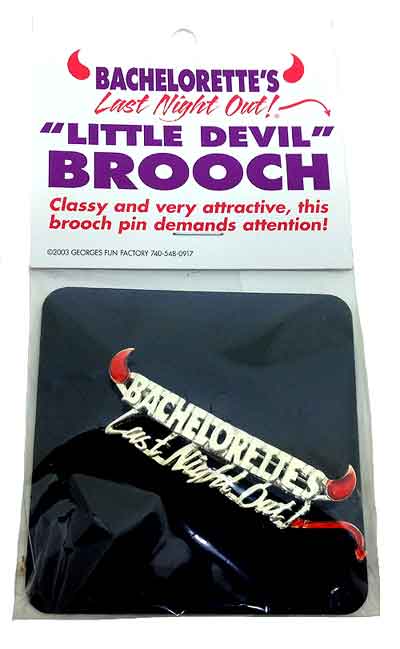 This cute pin has a long pin and clasp to make sure it stays on secure and is a shiny silver material (metal) with cute little red jewel-like horns on each end of the words BACHELORETTE'S and then a jewel like material also on a simulated devil tail at the bottom of the broach. The pin is almost a full 2" in length and is almost 3/4" tall.