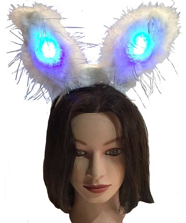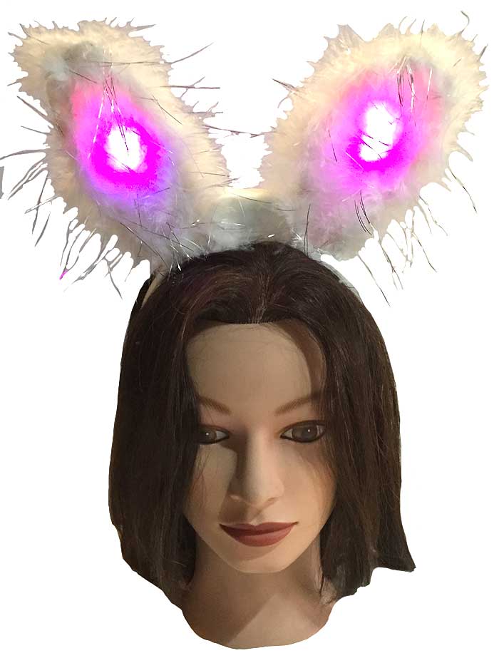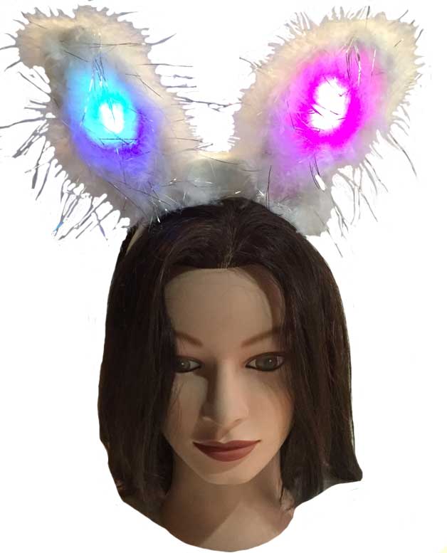 Each package comes with a furry white pair of Bunny Ears complete with strands of sliver tinsel all around them. The ears come with the batteries already inside, so all you have to do is flip on the switch, and watch them blink with Redish/Pink and Bluish/Purple little LED lights are definitely will get you all noticed!!