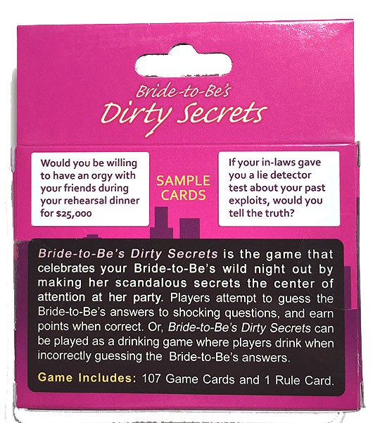The Bride-to-Be's Dirty Little Secret card game is fun addition for games to play at your next bachelorette party or maybe even a slightly racy bridal shower.