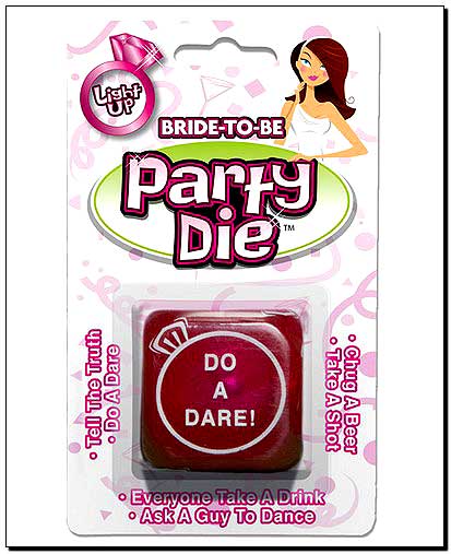A great game supply to pick up for the next Bachelorette Party, this Bachelorette Dare Light Up Die is large, almost a full 1 1/2" square so its easy to read and when bumped or rolled, it it has two bright led strobe type lights to light up the dares on the die.