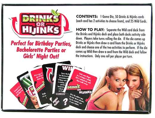 The Drinks or Hijinks game is perfect for your bachelorette party or girls night out celebration and comes with 1 game die, 50 drinks or hijinks cards (and each card has 2 different activities to choose from on the card) and 25 wild cards.