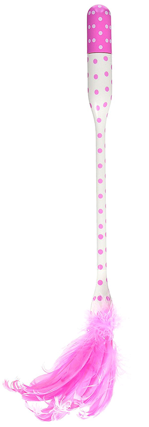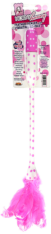 The Horney Honey series products are all in a cute white and pink with opposite colored poka dots, and this one is no exception!! The packaging of this Hott Products Vibrating Feather Tickler is super cute, and its functional to boot.