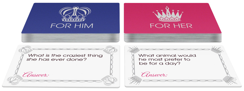 To prepare for the Mr. & Mrs. Trivia Card game, the Groom(s) or Partner answers all the questions on the "For Her" cards and the Bride(s) answers all the questions on the "For Him" cards. Then the decks are given to close friends for each. During the event Friends quiz each other and vice versa.