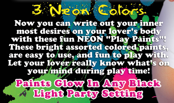Each pack of the Neon Body Paints comes with Green, Red and Yellow paints and applicator!