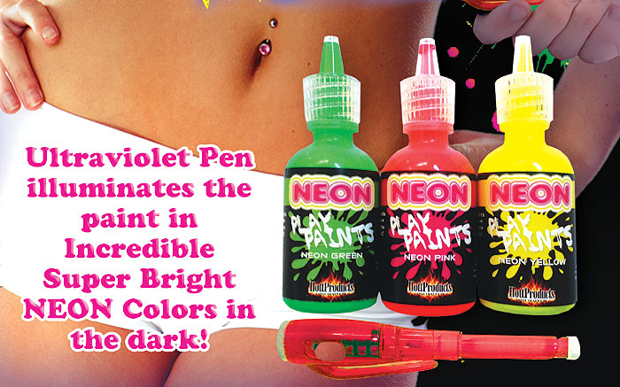 The package contains 3 containers with Neon Yellow, Green and Orange/Red colors and then come with a light up UV Pen, so after you get done painting and playing, you can light it up and watch it glow!!!