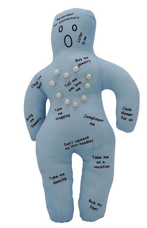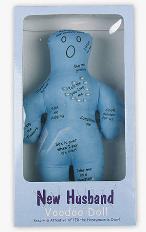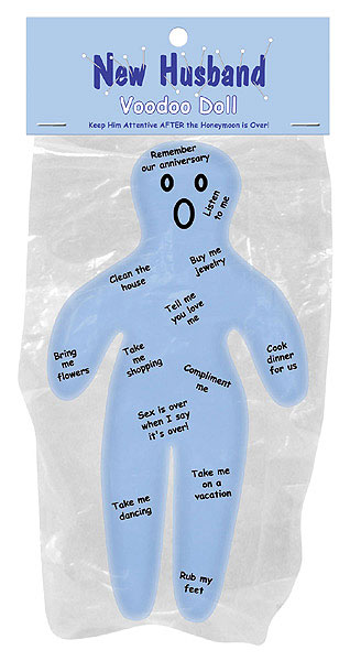 Some examples are Take Me Shopping, Buy Me Jewelry, Cook Dinner for Us, Take me on a Vacation, Rub My Feet, and the list goes on. The New Husband VooDoo Doll makes a wonderful and funny gift.