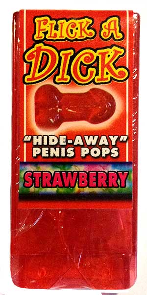 The Flick A Dick pecker lolli pops come in a unique storage container that hides the sucker, then you unfold the package, and the pecker sucker reveals itself allowing all the girls to take a suck then fold it back away and store it in a purse or pocket.