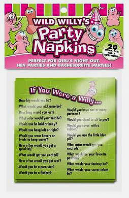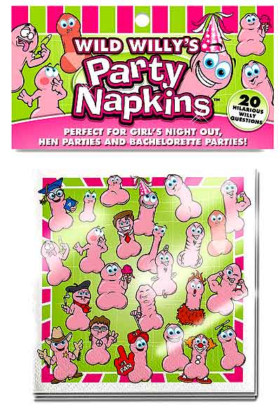 Another fun twist on a bachelorette party staple, these Wild Willy's Party Napkins are your regular sized - full size napkins just with a fun twist, they are a game as well as just a useful napkin!! Each package comes with Ten - 2-ply napkins and on the front are the cutest cartoon peckers you have ever seen, then on the back, each bachelorette party napkin has 20 hilarious willy questions to keep the party lively. The napkins measure 7" x 6".