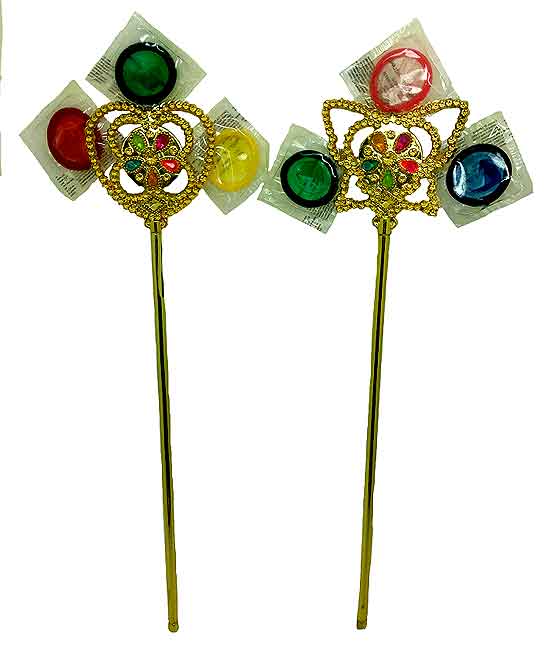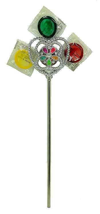The wand has little faux jewels adorn in the center of the wand and then around the outside are 3 colored condoms.