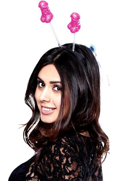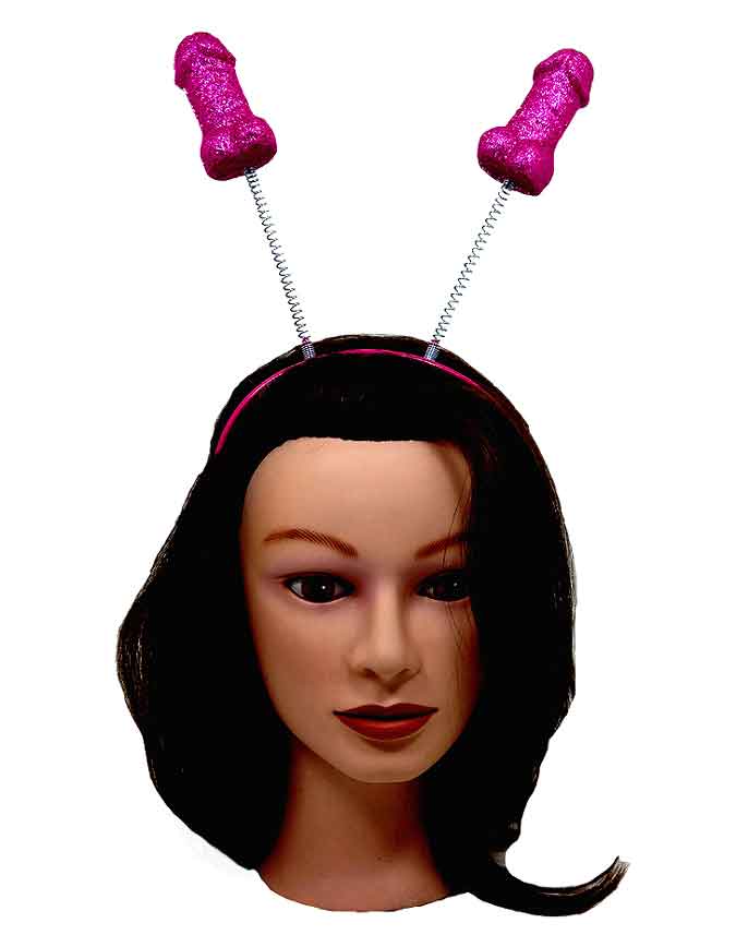 Each of the Pecker Boppers have a dark pink plastic head band with two springs attached at the top, with two super pink glittered 2" foam peckers that bounce around when you walk.