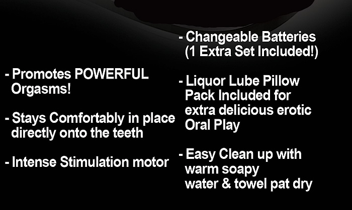 The protruding motor promotes strong powerful vibrations directly onto your partners intimate regions while comfortably remaining in place in the mouth, making it a first of its kind when it comes to oral vibrating stimulation. For an extra added good time... Enhance your oral experience even more with our great tasting 'Liqour Lube' personal flavored lubricant Included inside!"