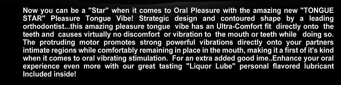 As the packaging describes: Now you can be a 'Star' when it comes to Oral Pleasure with the amazing new "Tongue Star' Pleasure Tongue Vibe! Strategic design and contoured shape by a leading orthodontist...this amazing pleasure tongue vibe has an Ultra-Comfort fit directly onto the teeth and causes virtually no discomfort or vibration to the mouth or teeth while doing so.
