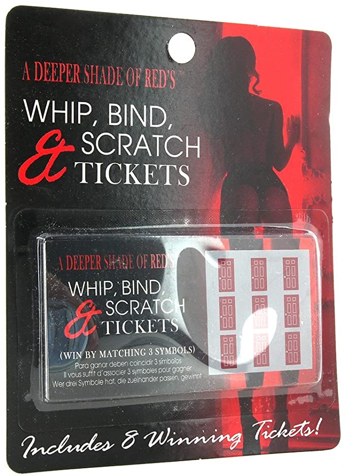 This Whip, Bind, & Scratch Tickets comes with 8 "Winning Tickets!", in as every time you play, someone or both will be Winners!! The winner chooses how to interpret the matching symbols, which include Restraints, Playful Whipping, Naughty Nipple Nibbles, Dominatrix, Scratch Playfull, Doggie Style on Leash, Tied to Hanger in Closet, & Sex Slavery!!.