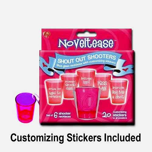 Each package comes complete with 6 clear/pinkish hanging shot glasses, each one having a sturdy white string that the shot glass hangs from, and the best part - besides the fact that for this price there are SIX shot glasses, but then the box includes 20 customizable stickers so that everyone can personalize their very own shot glass!